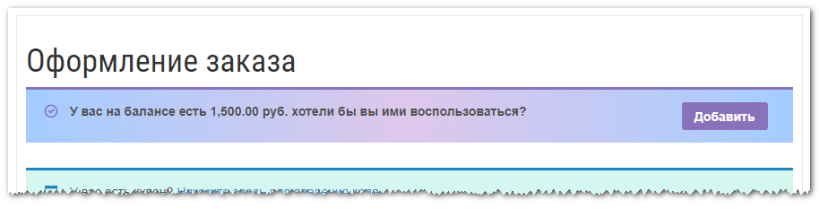Если суммы на личном балансе не достаточно для оплаты всего заказа, на странице оформления заказ вы увидите уведомление о возможности частичной оплаты с личного баланса: