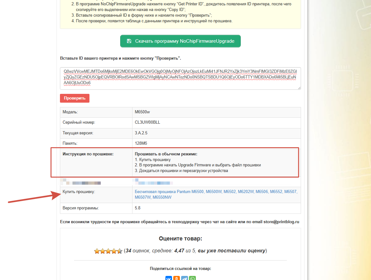 5. После проверки, появится таблица с данными принтера и инструкцией по прошивке: