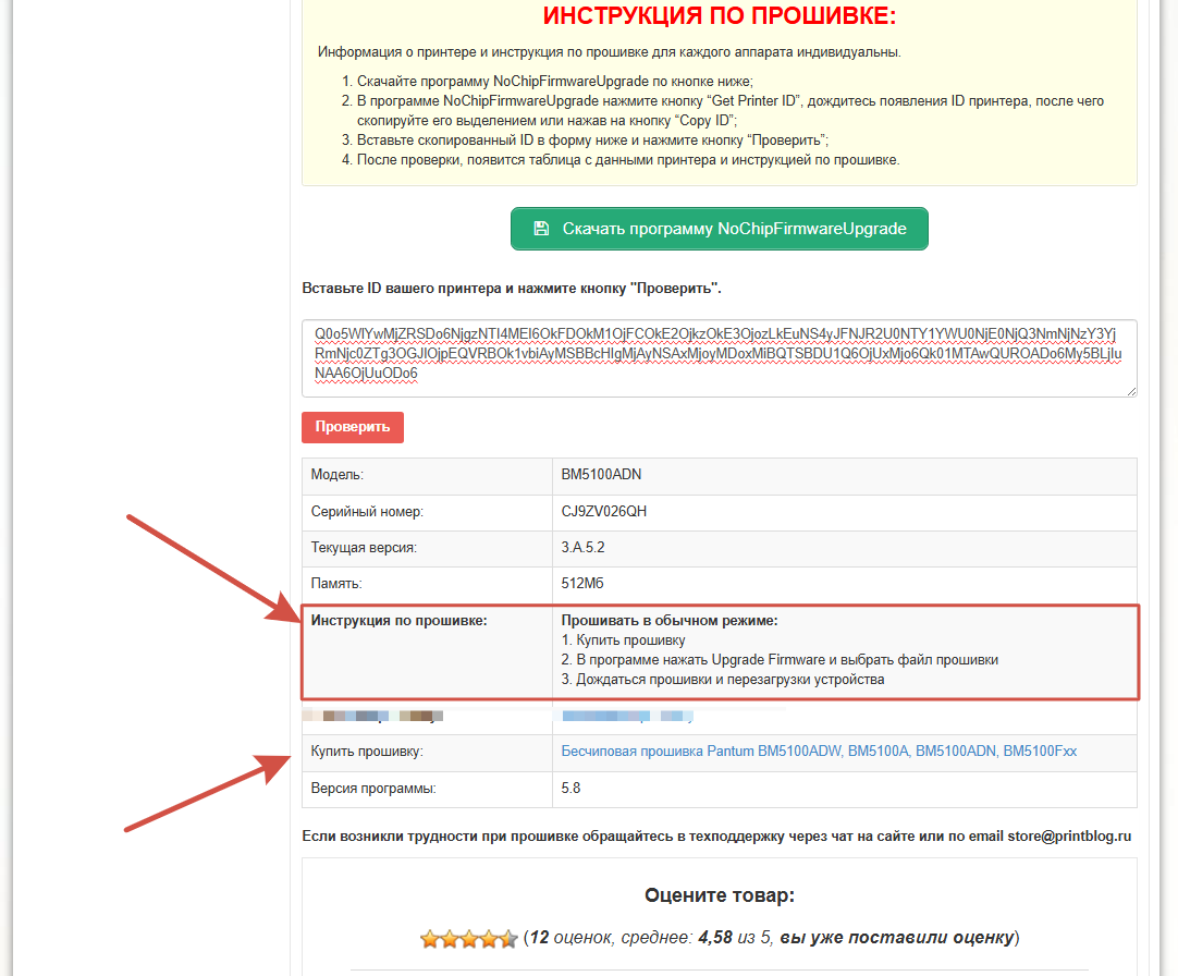 5. После проверки, появится таблица с данными принтера и инструкцией по прошивке: