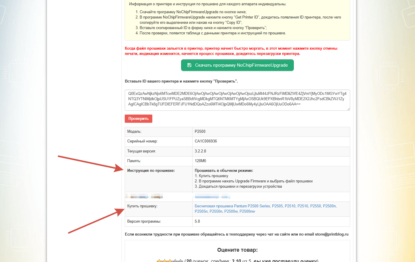 5. После проверки, появится таблица с данными принтера и инструкцией по прошивке: