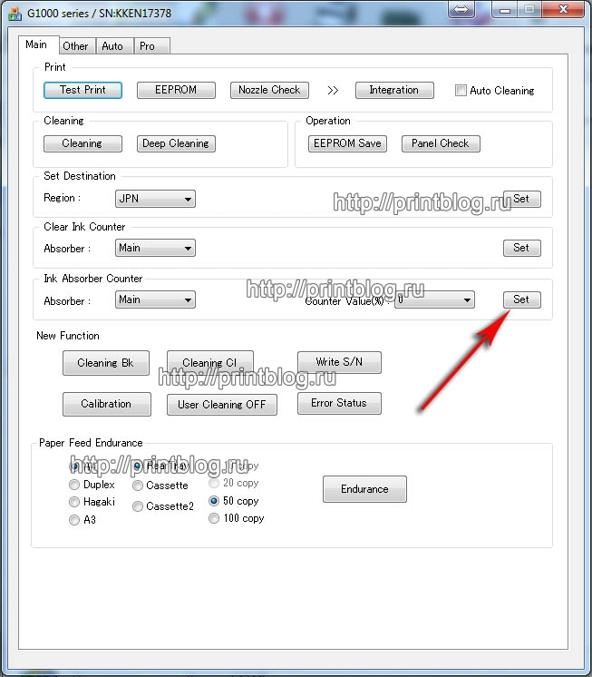 В программе находим блок Ink Absorber Counter и нажимаем кнопку SET как показано на картинке
