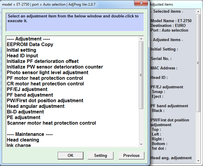 Adjustment program Epson ET-2700, ET-2750, ET-2751, ET-2756 – это сервисная программа, которая позволяет сбросить счетчик памперса (отработка, абсорбер), прописывать ID печатающей головки, делать инициализацию принтера, прописывать двигатель и выполнять другие функции, версия программы полная.