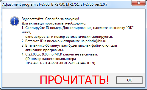 - Запустите программу Adjprogr.exe двойным щелчком мыши. Появится окно с номером ID, копируете нажатием кнопки “ОК” в этом окне, окно закроется, номер скопируется автоматически, отправляете его на email printb@bk.ru с темой “Я купил у вас программу Adjustment program Epson Stylus Photo ET-2700, ET-2750, ET-2751, ET-2756”: