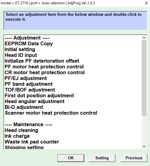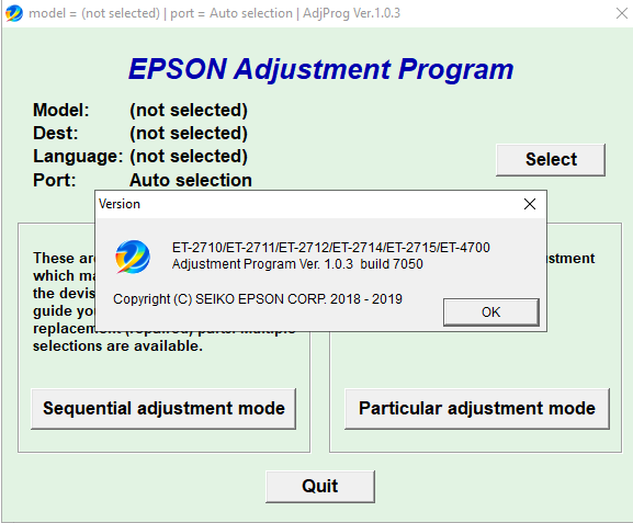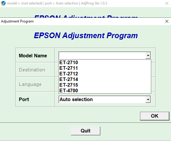 Adjustment program Epson ET-2710, ET-2711, ET-2712, ET-2714, ET-2715, ET-4700 – это сервисная программа, которая позволяет сбросить счетчик памперса (отработка, абсорбер), прописывать ID печатающей головки, делать инициализацию принтера, прописывать двигатель и выполнять другие функции, версия программы полная.