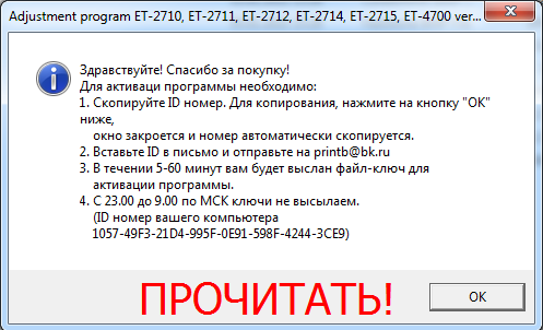 - Запустите программу Adjprogr.exe двойным щелчком мыши. Появится окно с номером ID, копируете нажатием кнопки “ОК” в этом окне, окно закроется, номер скопируется автоматически, отправляете его на email printb@bk.ru с темой “Я купил у вас программу Adjustment program Epson Stylus Photo ET-2710, ET-2711, ET-2712, ET-2714, ET-2715, ET-4700”:
