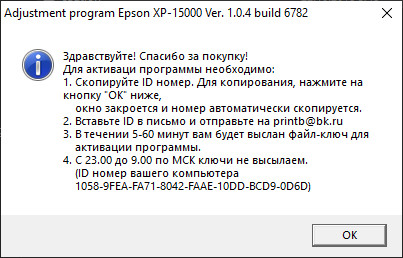 - Запустите программу Adjprogr.exe двойным щелчком мыши. Появится окно с номером ID, копируете его нажатием кнопки “ОК” в этом окне, окно закроется, номер скопируется автоматически, отправляете его на email printb@bk.ru с темой “Я купил у вас программу Adjustment program Epson XP-15000 (ПАМПЕРС НЕ СБРАСЫВАЕТ, только Platen pad counter)”: