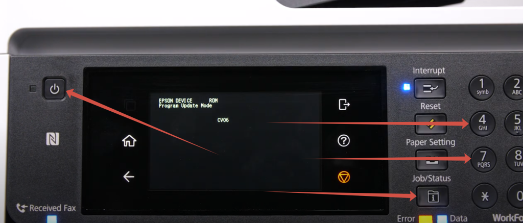 Для этого его необходимо включить с помощью следующей комбинации кнопок: Зажимаем кнопки “4”+ “7”+”job/status” + кнопка включения принтера (см. скриншот ниже). Держим пока на дисплее не появится надпись Program update mode (около 3 сек.)
