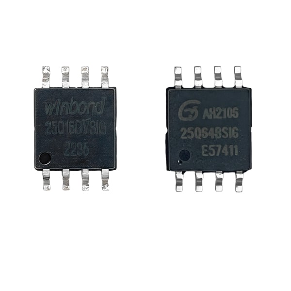 - Выпаять микросхему 25Q64 и 25Q16 , впаять на их место полученные, прошитые микросхемы (обратить внимание на ключи микросхемы и на качество пайки):