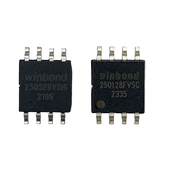 - Выпаять микросхемы 25L128 и 25Q32, впаять на их место полученные, прошитые микросхемы (обратить внимание на ключи микросхем и на качество пайки):